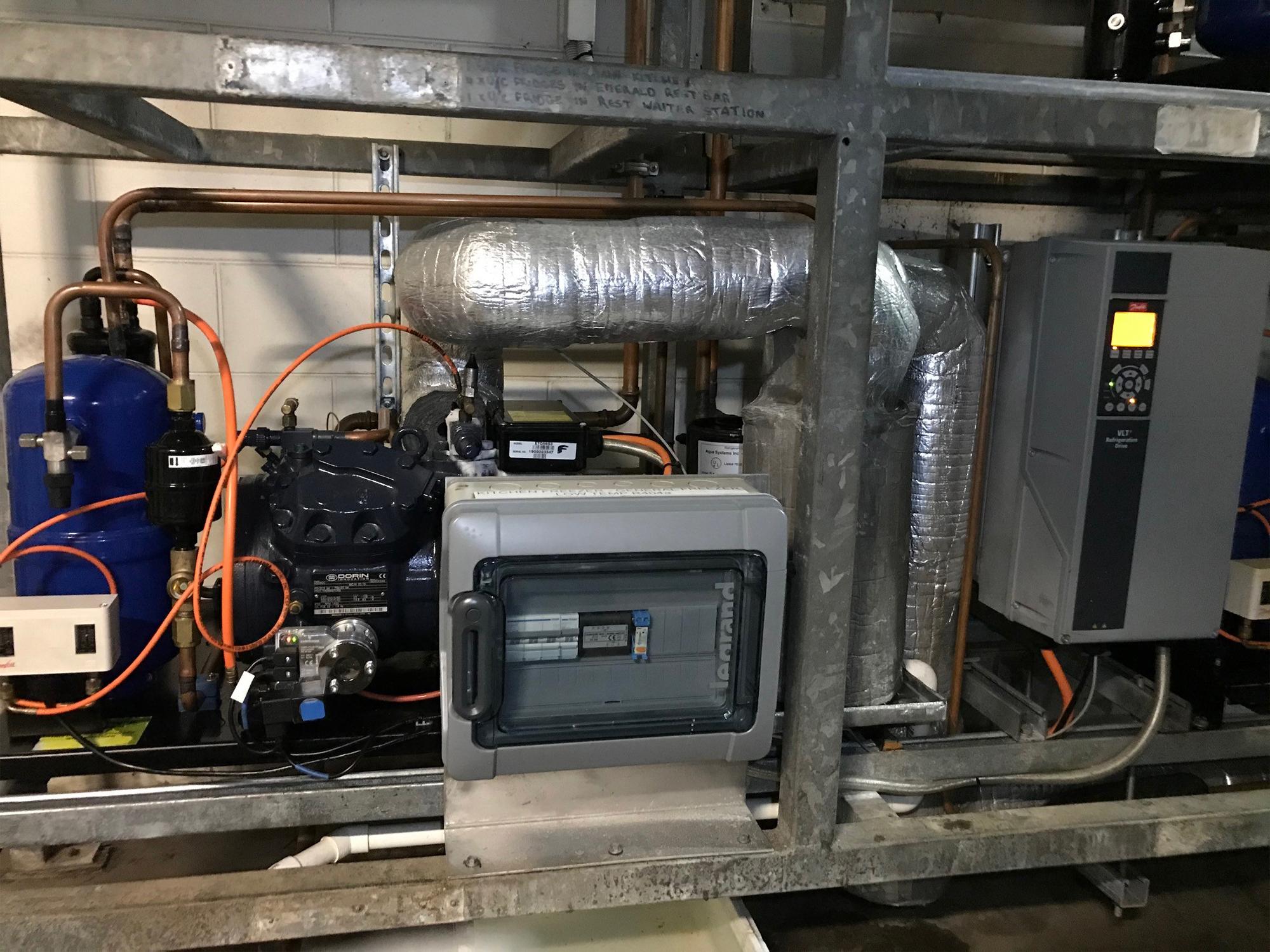 With the intention of lowering the power consumption of the refrigeration equipment, reducing the GWP ( global warming potential ) of the refrigerant used on site and reducing the impact on the eco system caused by excessive noise the decision was made to install 3 x water cooled refrigeration condensing units utilising the Resorts existing cooling tower. These three systems were to replace the existing 8 x air cooled systems currently in use, each of the new refrigeration condensers was to be capacity controlled with Danfoss VLT variable speed drives, Danfoss thermostatic expansion valves and superheat controls for each new evaporator.